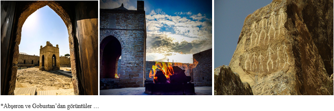 Sabah kahvaltısı sonrası otellerimizden üniversiteye hareket edeceğiz ve sempozyum sonrasında 14.30 itibariyle Bakü’yü gezmeye devam edeceğiz. Bugünkü rotamız Abşeron Yarımadası. Abşeron Yarımadası’nda dünyadaki Üç Mecusi (Zerdüşt) tapınaktan biri olan Ateşgah Mimari Kompleksi’ni göreceğiz. Oldukça ilgi çekici olan ve içindeki ateşi yüzyıllardır sönmeyen bu yapı, Mecusi inanışıına göre belli başlı Hac mekanlarından birisidir. Ateşgah ziyaretimizin ardından ünlü seyyah Marco Polo’nun ‘’Ateş Ülkesi’’ adını yakıştırdığı yanardağı ziyaret edeceğiz. Yanardağ toplamda 65 hektarlık bir alanda var olan ve yer altından çıkan doğalgazın etkisiyle yüzyıllardan beri yanmaya devam etmektedir. Ziyaretimizin ardından Bakü’nün 70 km. güneyinde yer alan, Azerbaycan’ın arkeolojik eserler bakımından en zengin bölgesi olan ve UNESCO Dünya Mirası Listesi’nde yer alan Gobustan’a doğru yola çıkacağız. Hazar Denizi’nin yakınlarında, eski Şirvan yolu üzerinde bulunan Gobustan; açık hava müzesi olarak da adlandırılmaktadır. Burası, tüm dünyada oyma kayalıkları ve resimli taşları ile tarih öncesi Ortaçağ dönemindeki toplum yaşantısı, avcılık, hayvanlar ve bitki örtüsü hakkında önemli bilgiler vermektedir.